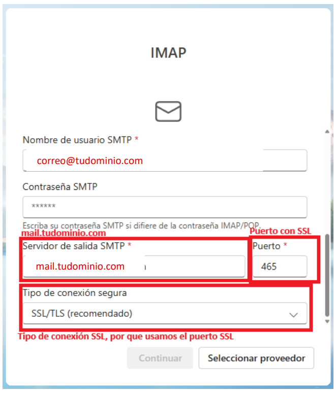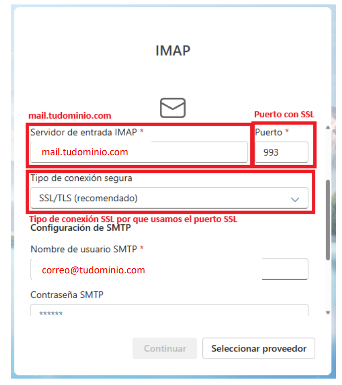En esta pantalla de configuración avanzada podrás modificar el servidor de entrada y salida, así como los puertos correspondientes y el tipo de conexión segura (SSL o sin SSL).