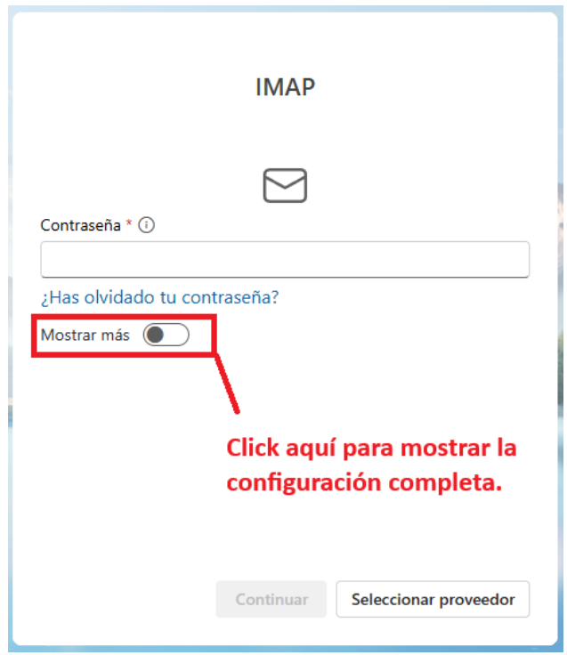 Has clic en "Mostrar más" para desplegar todas las opciones de configuración avanzadas de la cuenta, como los servidores de entrada y salida, puertos y tipo de seguridad.