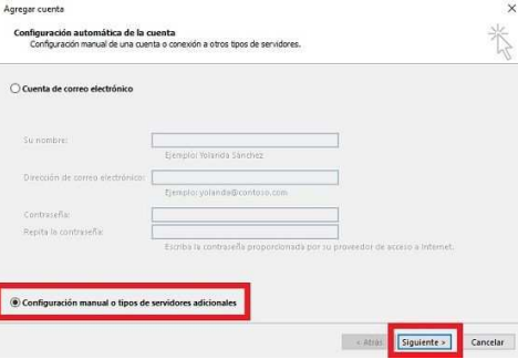 3. En la ventana que aparece elige Configuración manual o tipos de servidores adicionales y haz clic en Siguiente.
